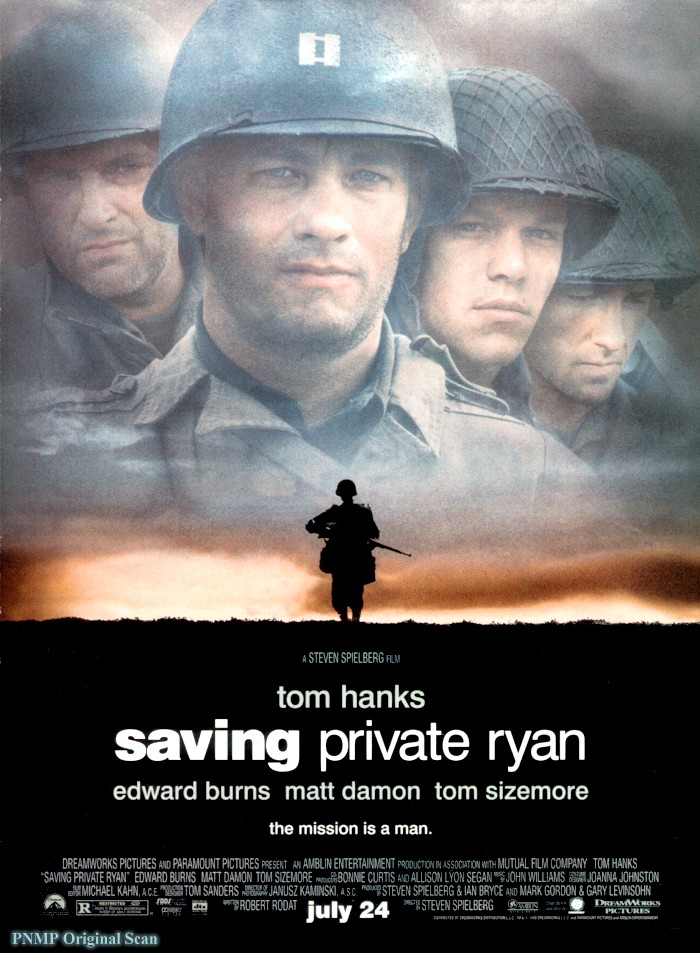 <Saving Private Ryan>은 스티븐 스필버그 감독의 1998년 전쟁 영화로 톰 행크스, 멧 데이먼, 그리고 톰 시즈모어가 주연을 맡았다. 이 영화는 노르망디 상륙작전 이후 실종된 낙하산 병사 제임스 프랜시스 라이언 일병을 찾기 위해 파견된 미군들의 이야기를 담고 있다. 전쟁의 폭력과 공포를 생생하게 묘사하였고 노르망디의 D-Day 침공을 묘사한 오프닝 장면은 영화 역사상 가장 강렬하고 현실적인 전쟁 장면 중 하나로 널리 여겨진다. 영화에서 전투 장면은 사실주의로 유명하다. 스티븐 스필버그 감독과 그의 팀은 역사적 연구, 군사 고문, 그리고 시대 무기와 장비를 상세하게 재현을 하고 전투 순서를 최대한 정확하게 맞추기 위해 많은 노력을 기울였다. 그 결과 전쟁의 폭력과 혼란을 본능적이고 강렬하게 묘사하여 진짜 전쟁을 보는 것 같다는 찬사를 받고 있다. 전투에 대한 본능적인 묘사 외에도 전쟁 중 군인들 사이에 형성될 수 있는 의무, 희생, 동료들 간의 유대감 등의 주제를 탐구한 것으로도 유명하다. 이 영화는 7천만 달러의 제작 예산에 비해 전 세계적으로 4억 8천1백만 달러 이상의 수익을 거두며 상업적으로도 성공을 거두었다. 1998년에 가장 높은 수익을 올린 영화였으며, 당시 스필버그 감독의 경력 중 쥬라기 공원에 이어 두 번째로 높은 수익을 올린 영화였다. 이 영화는 또한 최우수 작품상, 최우수 감독상, 최우수 각본상을 포함한 11개의 아카데미상 후보에 올랐다. 스티븐 스필버그 감독상과 야누시 카민스키 촬영 감독상을 포함한 5개의 상을 수상했다. 라이언 일병 구하기는 지금까지 만들어진 가장 중요한 전쟁 영화 중 하나로 여겨지며 전쟁 영화 장르의 고전이 되었다.