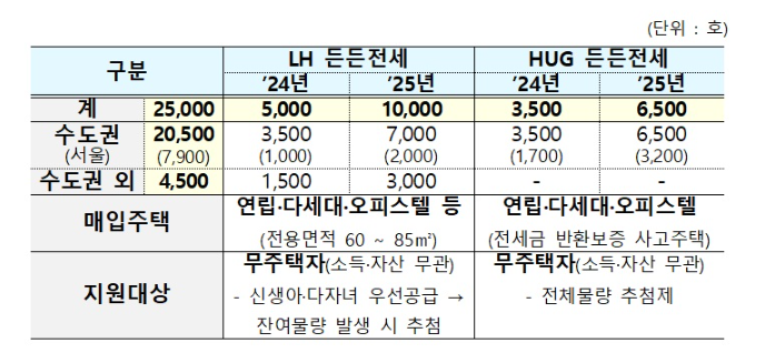 LH 든든전세주택은 3-4인 가구가 생활 할 수 있는 전용면적 60~85㎡의 신축 주택 1만 5천가구를 매입하여 제공할 예정이며 HUG 든든전세주택은 집주인 대신 전세금을 돌려주고 경매 신청한 주택을 HUG가 직접 낙찰받아 1만 가구를 매입합니다.